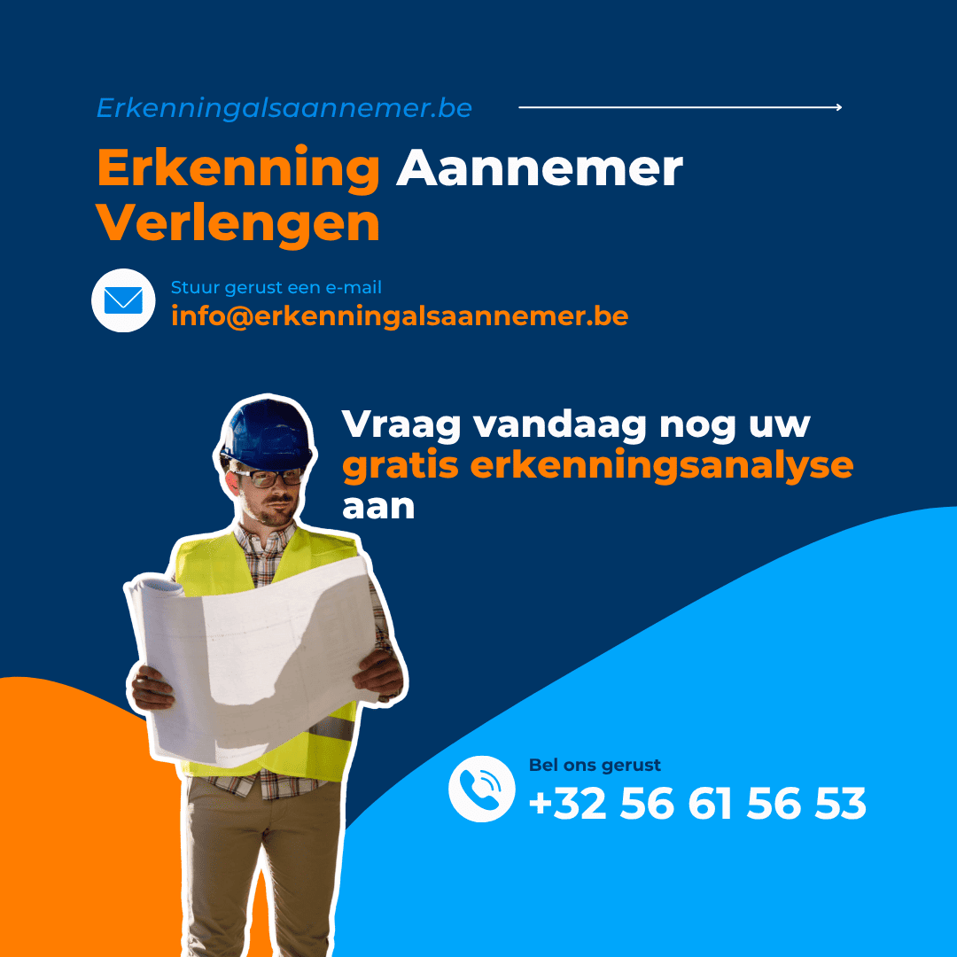 Laat u begeleiden door een expert en zorg dat uw erkenning tijdig verlengd wordt. Vraag vandaag nog uw gratis analyse aan en ontdek de mogelijkheden voor uw bouwbedrijf.